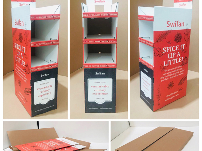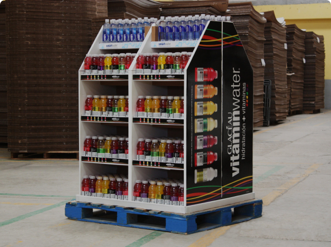 Exhibidor de piso manufacturado en cartón corrugado de alta calidad para la exhibición de productos de todo tipo. Su diseño modular permite una gran capacidad de almacenamiento de producto con una visibilidad de 360 º.